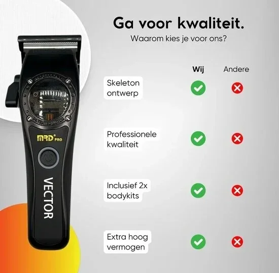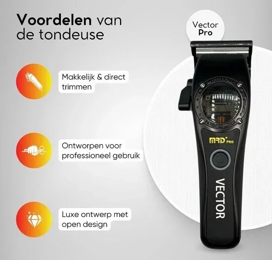De MRD® Pro Vector Professional Tondeuse Clipper is ontworpen voor kappers en barbers die maximale precisie en betrouwbaarheid eisen. Deze krachtige clipper is ideaal voor knipwerk, fades en contouren en biedt een soepele, nauwkeurige snit bij elk haartype. Dankzij het ergonomische ontwerp en de professionele prestaties is deze tondeuse perfect voor intensief salongebruik.